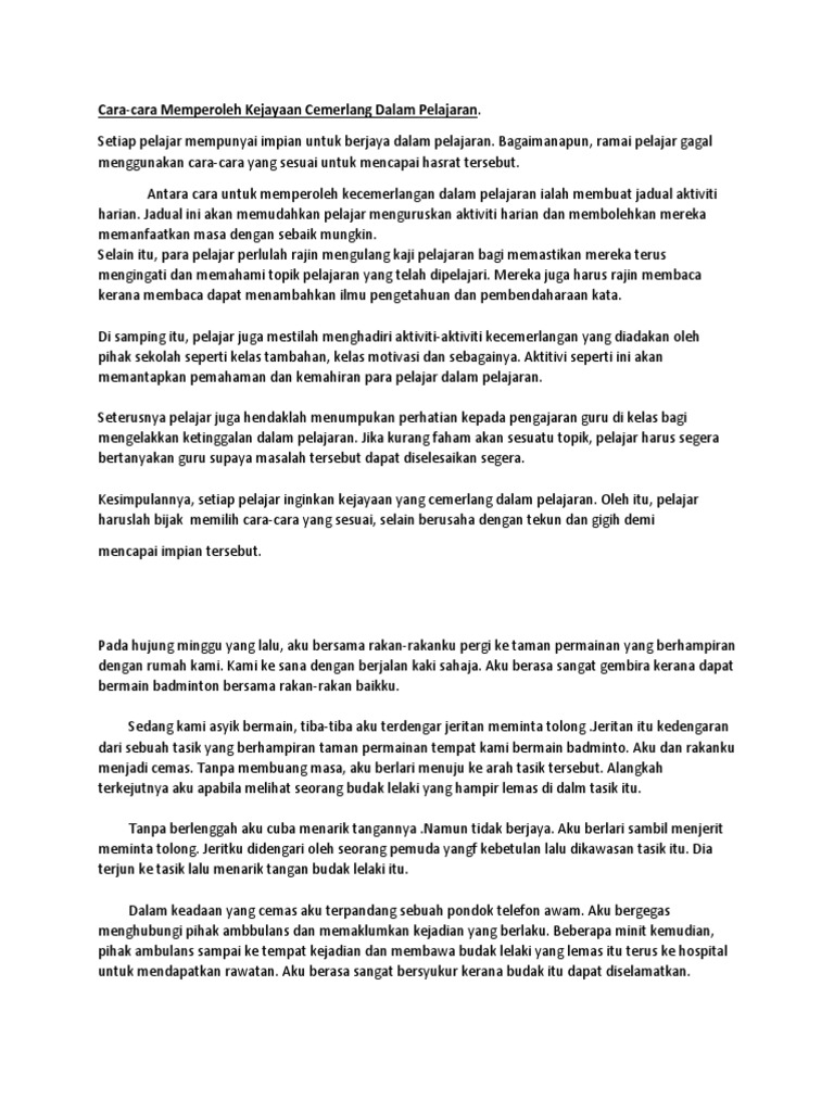 Bagaimanapun ramai pelajar gagal menggunakan cara-cara yang sesuai untuk mencapai hasrat tersebut. Tulis karangan tentang cara-cara menjadi murid yang cemerlang dalam pelajaran. Selaras dengan usaha kerajaan untuk memastikan Malaysia muncul sebagai sebuah negara maju berpendapatan tinggi menjelang 2020 pembangunan modal.